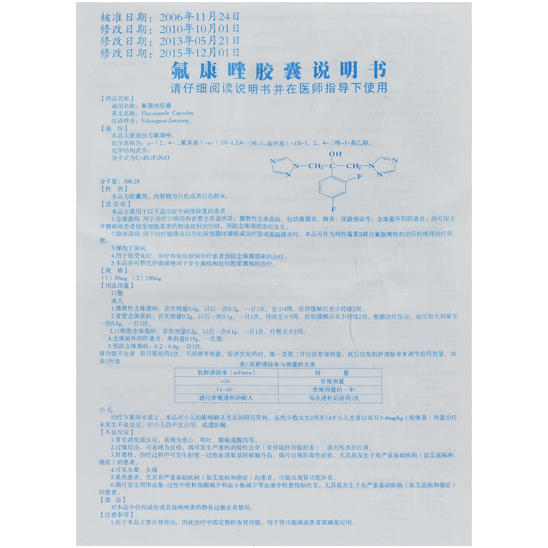 【用法用量】 口服。 成人 (1)播散性念珠菌病:首次剂量0.4g,以后一次0.2g,一日1次,至少4周,症状缓解后至少持续2周。(2)食道念珠菌病:首次剂量0.2g,以后一次0.1g,一日1次,持续至少3周,症状缓解后至少持续2周。根据治疗反应,也可加大剂量至一次0.4g,一日1次。(3)口咽部念珠菌病:首次剂量0.2g,以后一次0.1g,一日1次,疗程至少2周。(4)念珠菌外阴阴道炎:单剂量,0.15g。(5)预防念珠菌病:有预防用药指征者0.2~0.4g,一日1次。 肾功能不全者 若只需给药1次,不用调节剂量;需多次给药时,第一及第二日应给常规剂量,此后应按肌酐清除率来调节给药剂量,如下表所述: 肌酐清除率(ml/分钟) 剂 量 >50 常规剂量 11~50 常规剂量的一半 进行常规透析的病人 每次透析后给药1次 小儿 治疗方案尚未建立。有资料报道起始剂量按体重一日3~6mg/kg,一日1次,治疗少数出生2周至14岁的小儿患者,结果是安全的。