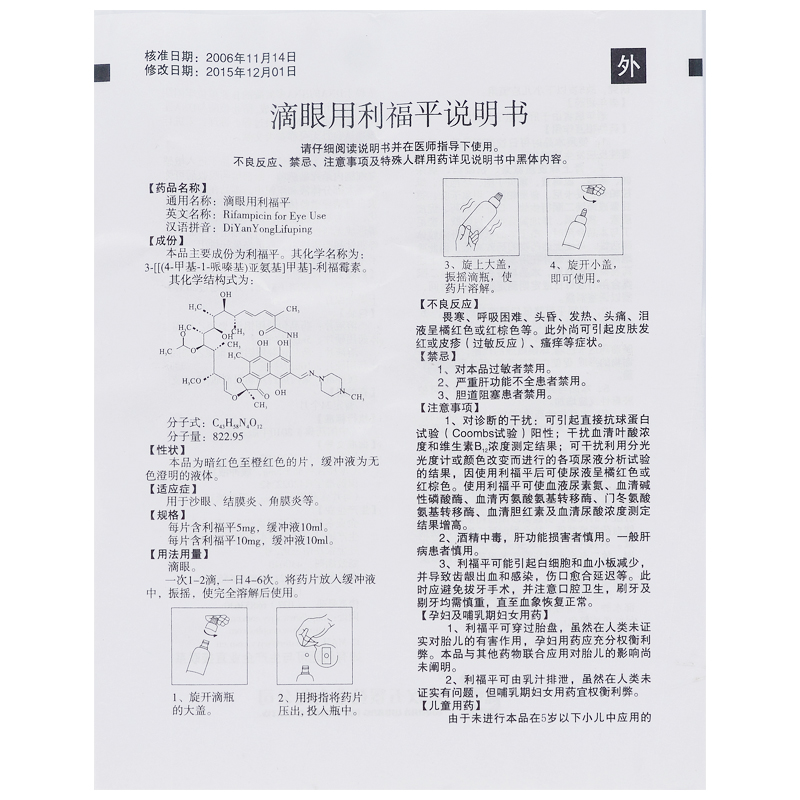 药代动力学 利福平为脂溶性抗生素,易于进入敏感菌细胞内杀死敏感菌。眼部给药吸收后可弥散至大部分体液和组织中,本品在肝脏中可被自身诱导微粒体氧化酶作用而迅速去乙酰化,成为具有抗菌活性的代谢物,然后经水解形成无活性的代谢物由尿排出。本品主要经胆汁和肠道排出,亦可经乳汁排出。利福平不能经血液透析或腹膜透析清除。