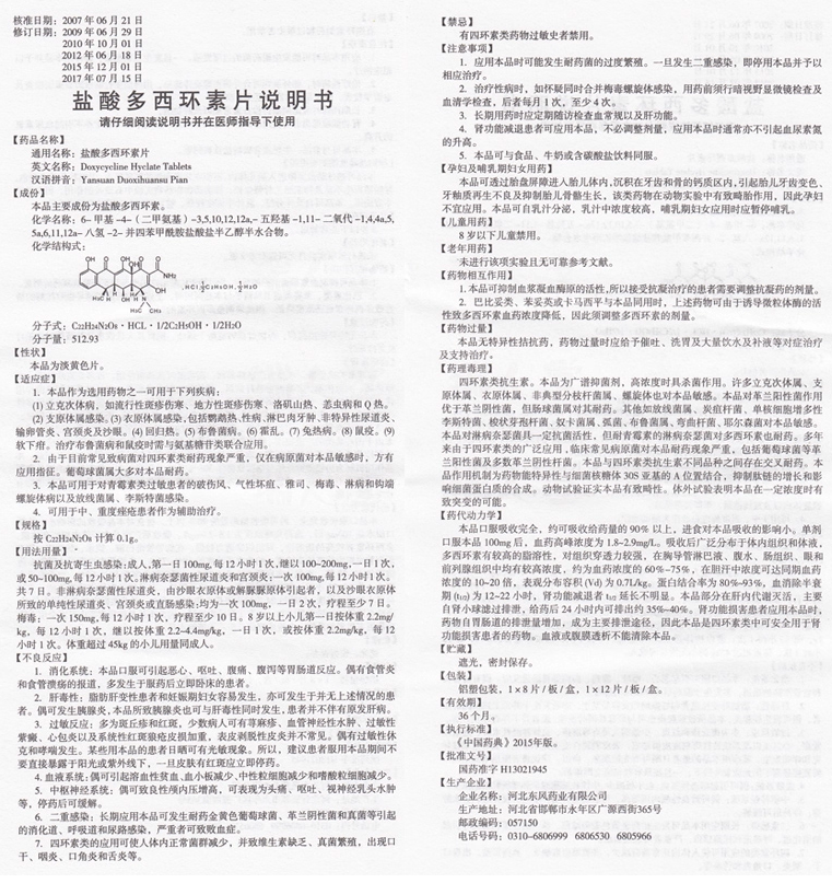 【药理毒理】 四环素类抗生素。本品为广谱抑菌剂,高浓度时具杀菌作用。许多立克次体属、支原体属、衣原体属、非典型分枝杆菌属、螺旋体也对本品敏感。本品对革兰阳性菌作用优于革兰阴性菌,但肠球菌属对其耐药。其他如放线菌属、炭疽杆菌、单核细胞增多性李斯特菌、梭状芽孢杆菌、奴卡菌属、弧菌、布鲁菌属、弯曲杆菌、耶尔森菌对本品敏感。本品对淋病奈瑟菌具一定抗菌活性,但耐青霉素的淋病奈瑟菌对多西环素也耐药。多年来由于四环素类的广泛应用,临床常见病原菌对本品耐药现象严重,包括葡萄球菌等革兰阳性菌及多数革兰阴性杆菌。本品与四环素类抗生素不同品种之间存在交叉耐药。本品作用机制为药物能特异性与细菌核糖体30S亚基的A位置结合,抑制肽链的增长和影响细菌蛋白质的合成。动物试验证实本品有致畸性。体外试验表明本品在一定浓度时有致突变的可能。